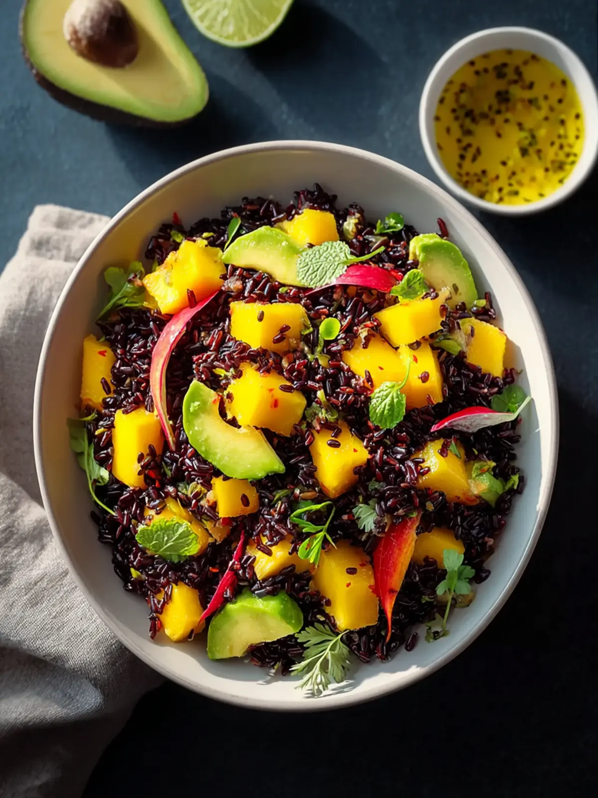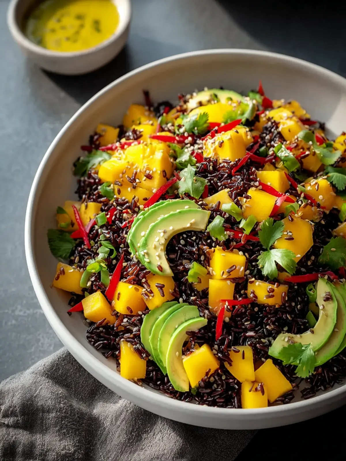 This refreshing black rice salad is packed with diced mango, avocado, and colorful vegetables, tossed in a zesty dressing.