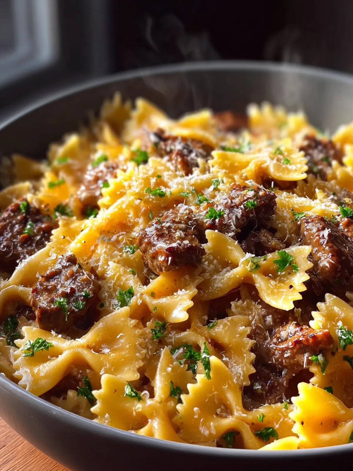 Garlic Butter Beef Cheesy Bowtie Pasta – Easy & Irresistible!
