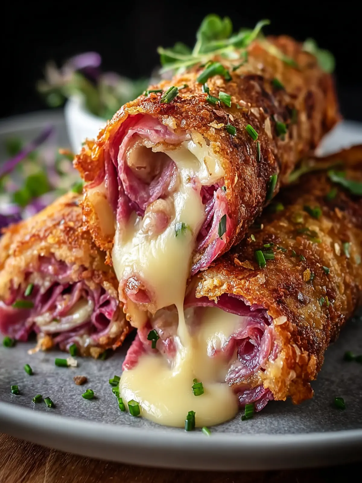 Deliciously crispy roll-ups featuring corned beef and melted cheese, perfect for a snack or appetizer.
