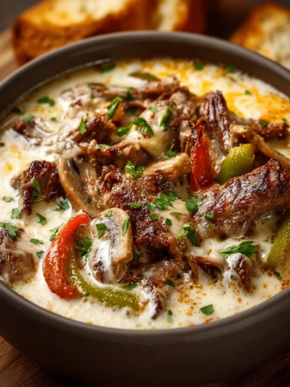 Serve your Philly Cheesesteak Soup in bread bowls for a rustic feel or with a side of crusty bread to dip into the delicious broth. A sprinkle of fresh parsley not only enhances the look but adds a fresh flavor burst.